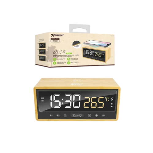 XPower QIC5 4 In 1 Bamboo Alarm Clock With 15W Wireless Charger - Brown