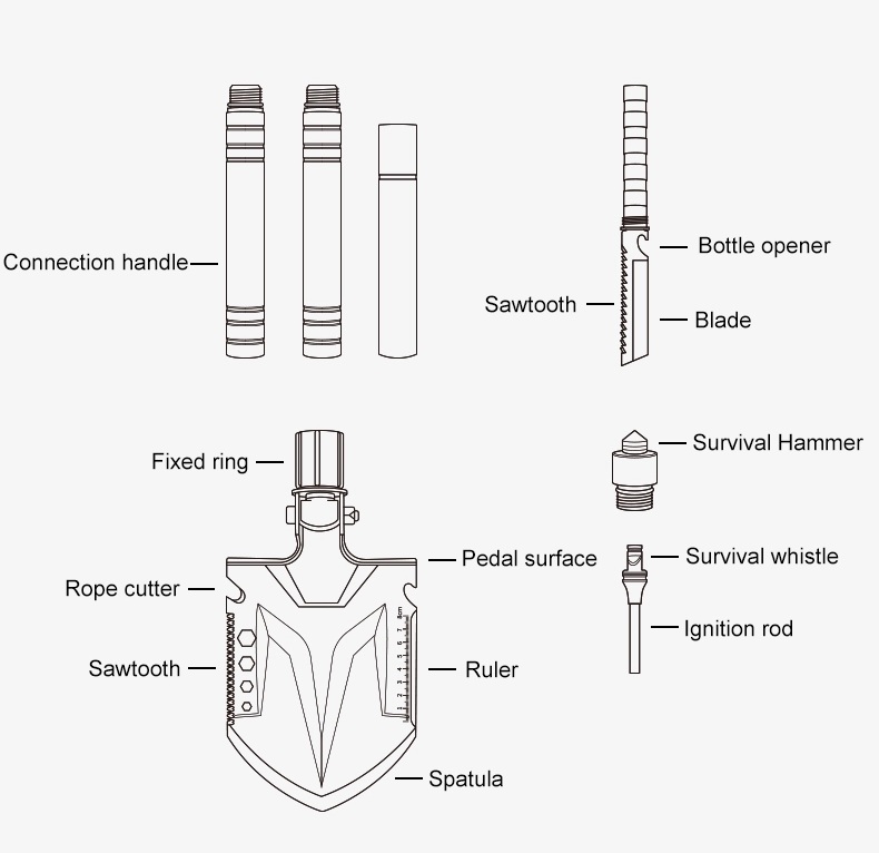 1. 1 hand shovel consists of 10 functions (shovel, 2 Sawtooth, Bottle opener, Blade, Survival Hammer, Survival Whistle, Ignition Rod, Rope Cutter, Ruler, Hexwrench)