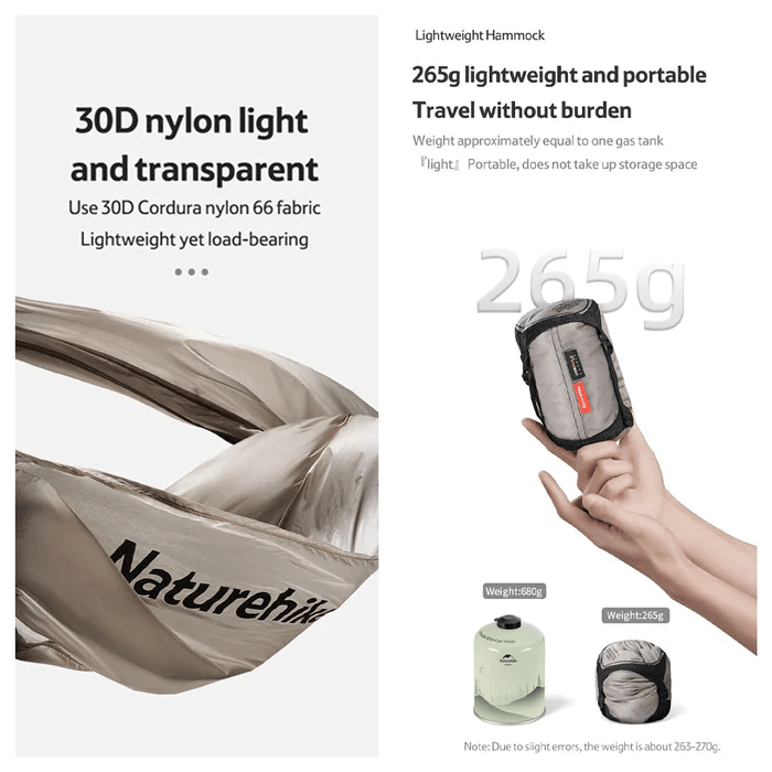 Weight : 265gr (Hammock) / 140gr (Hanging Bag)