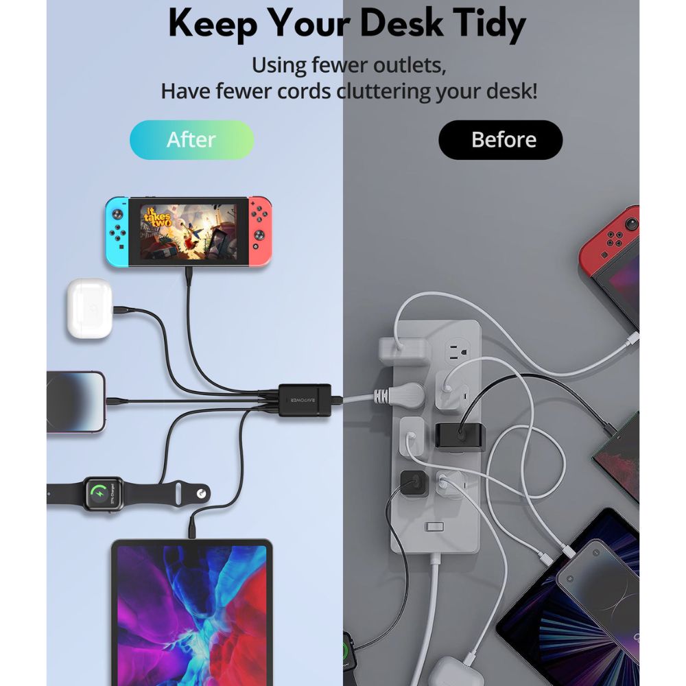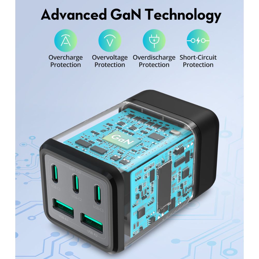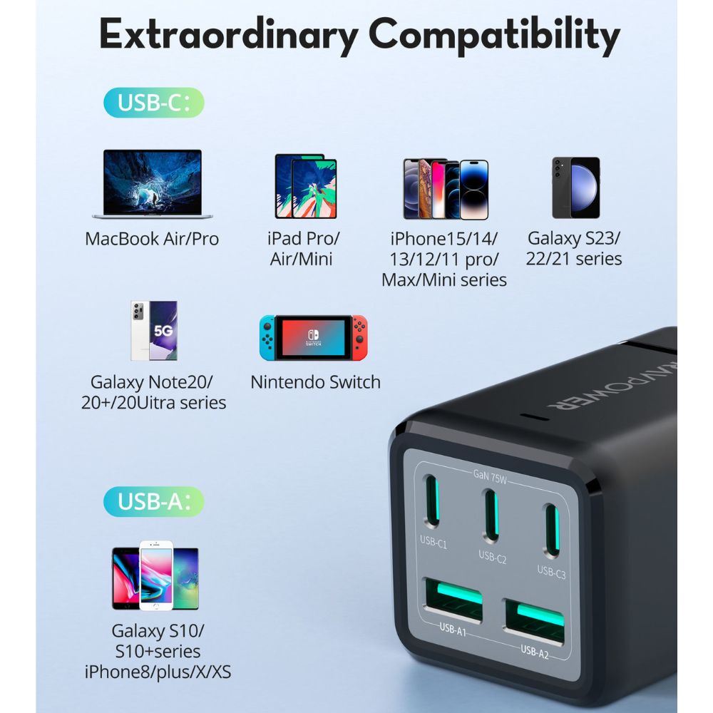 Charge 5 devices simultaneously, you can charge your phone, laptop and earphones. Connect one device to charge up to 75W.