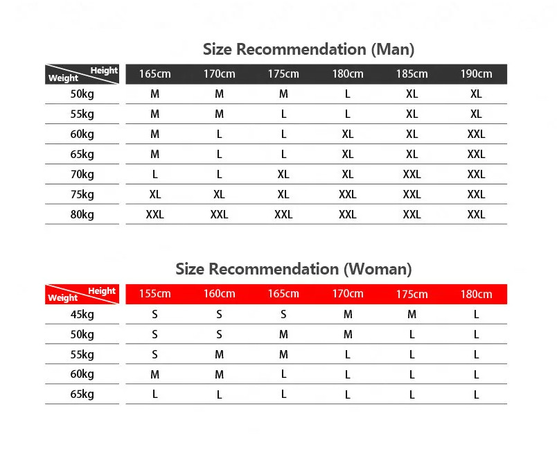 M, L, XL, XXL (Man) / S, M, L (Woman)