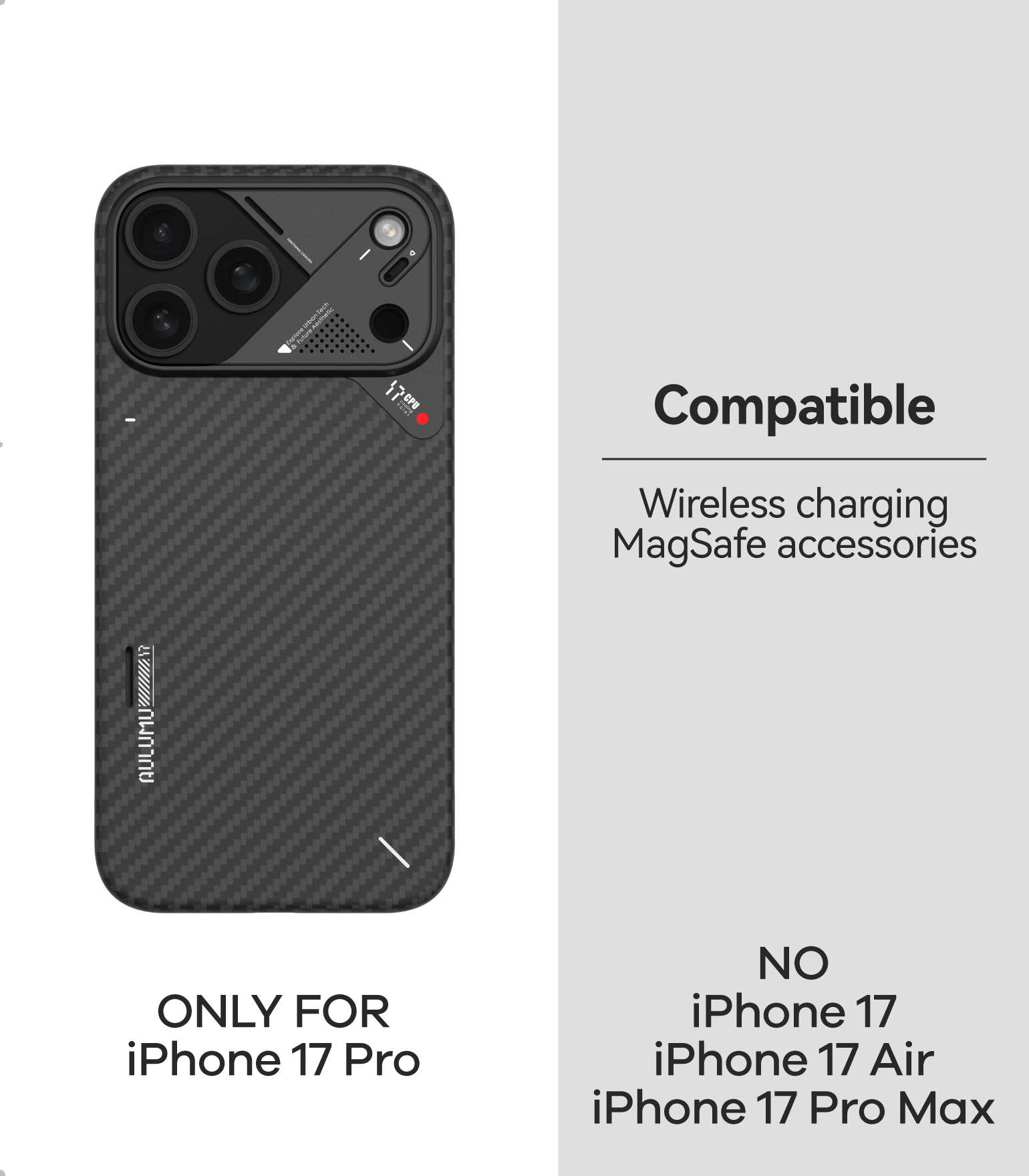 Building on the sleek design of our classic aramid fiber cases, the A17 Case brings ultra-thin, ultra-light protection to the iPhone 17 Series. Crafted from premium aramid fiber with an upgraded aluminum camera frame, it combines timeless durability with modern enhancements for smarter everyday use. Compatible with MagSafe and designed for a secure, comfortable grip, the A17 elevates both style and functionality for iPhone 17 Pro, 17 Pro Max and Air.