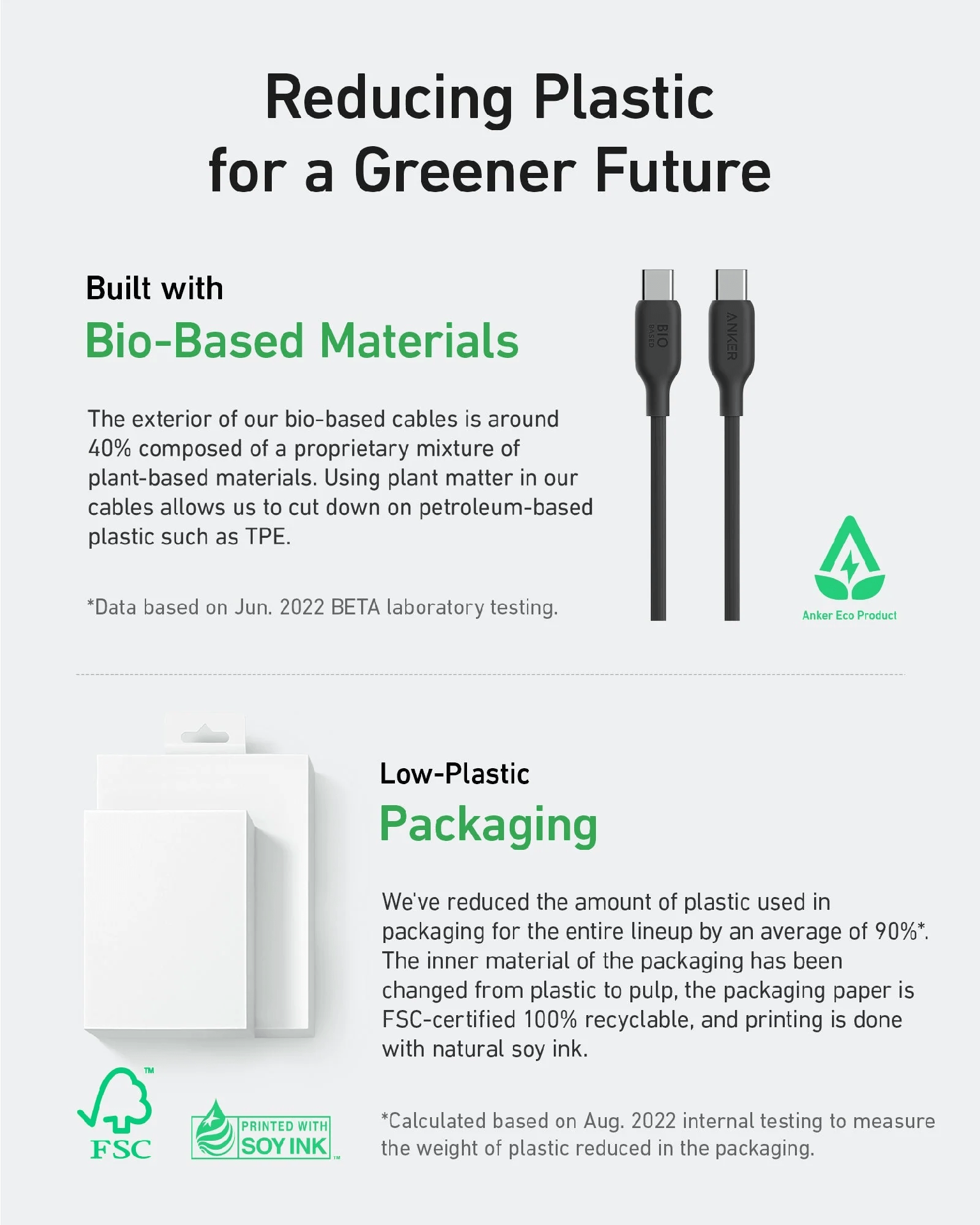 The exterior of bio-based cables is around 40% composed of a proprietary mixture of plant-based materials.