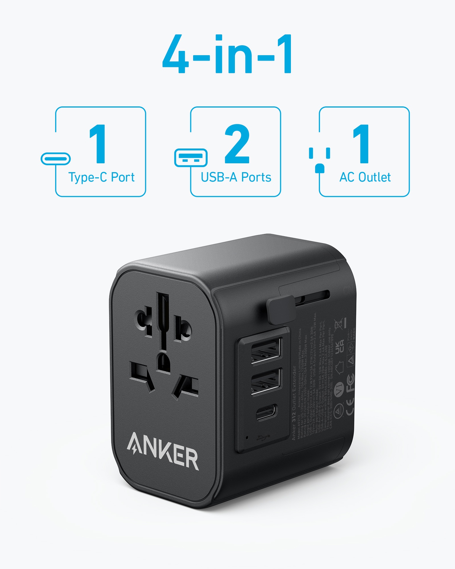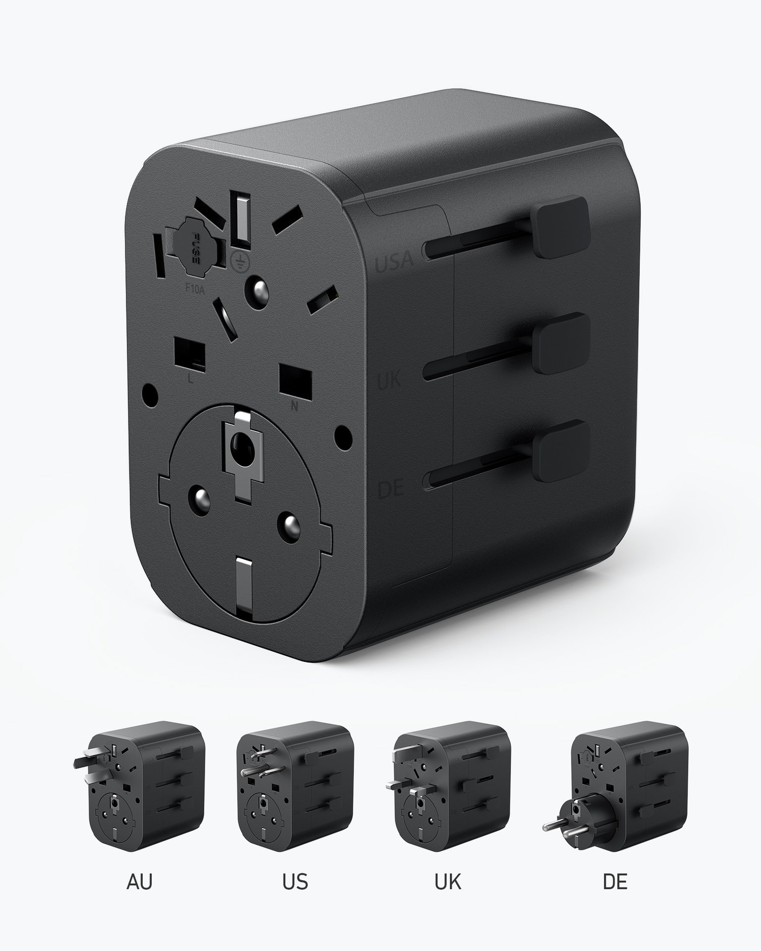 Multi-regional plugs - UK, EU, US, AU, works in more than 150 countries.