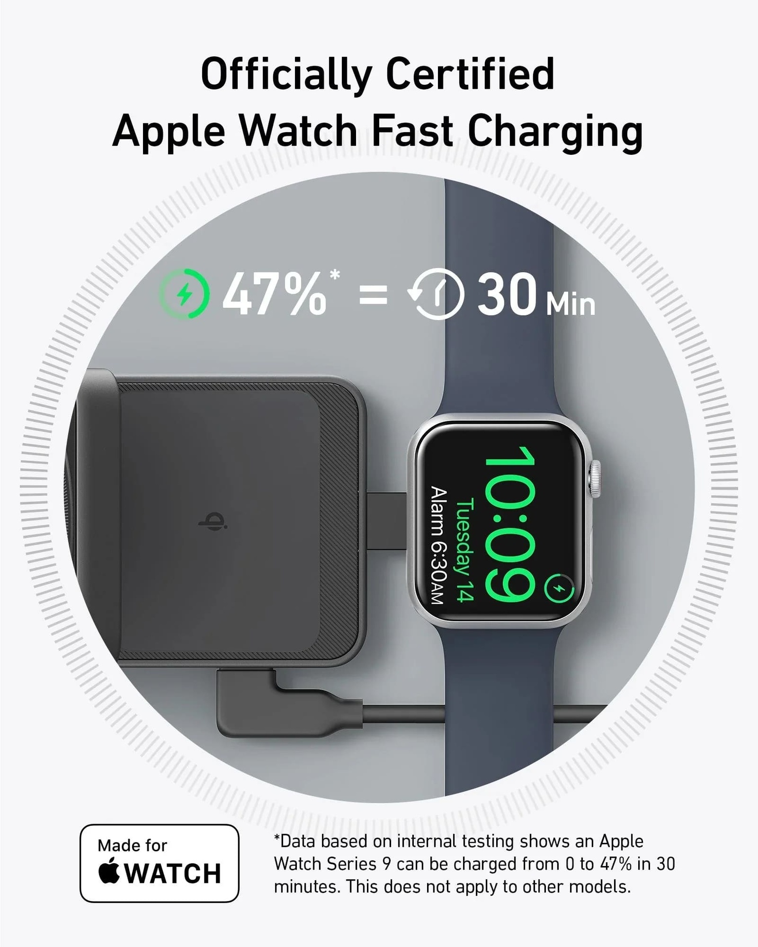 Quickly power up your Apple Watch Series 9 to 47% in just 30 minutes thanks to the MFW certification—significantly faster than non-certified chargers.
