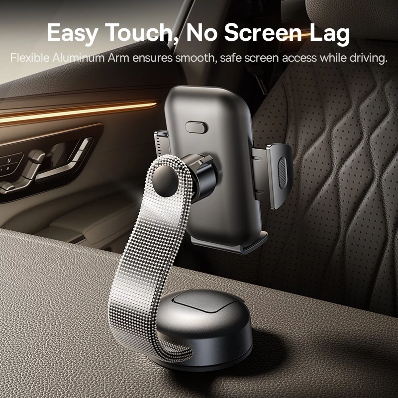 The robust suction base firmly adheres to smooth surfaces like dashboards or windshields. Easy-release lever allows clean removal without residue.