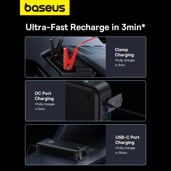 Battery-Free Jump Starter: Baseus Super Capacitor jump starter features built-in supercapacitor, which uses unique supercapacitor technology. NO REQUIRE PRE-CHARGING. It only takes a few minutes to get charged from your weak car battery, then instantly start all the 12 volt vehicles.