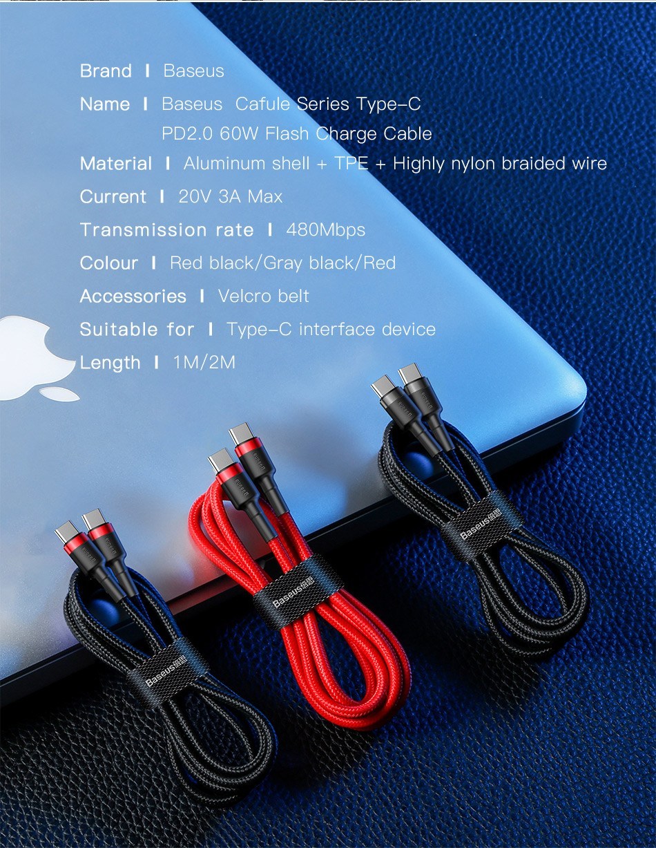 • Baseus Cafule Series Type-C PD2.0 60W Flash charge Cable (20V 3A) 2M Gray Black ; PD 60W fast charging support; QC 3.0 support fast charging.