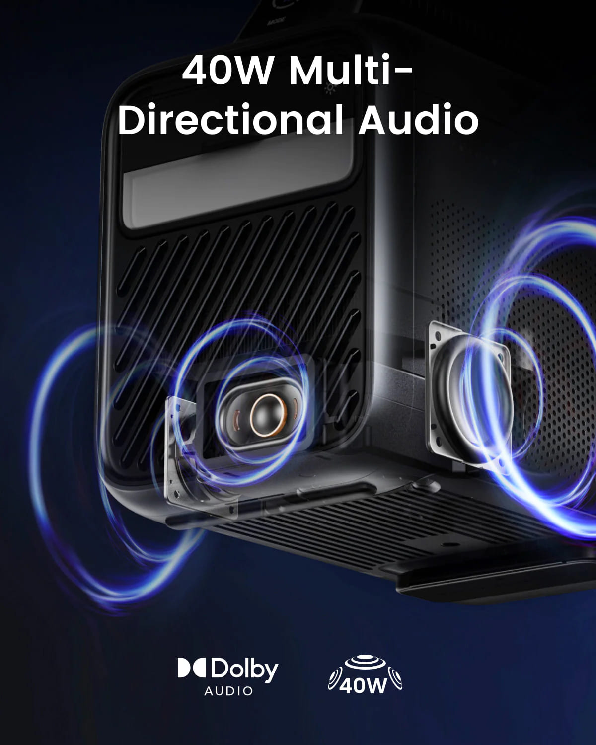 The built-in 40W speaker with Dolby Digital Plus delivers crisp and immersive outdoor audio to make movies sound amazing, and music sound crisp and clear with up to 15 hours of music playback.