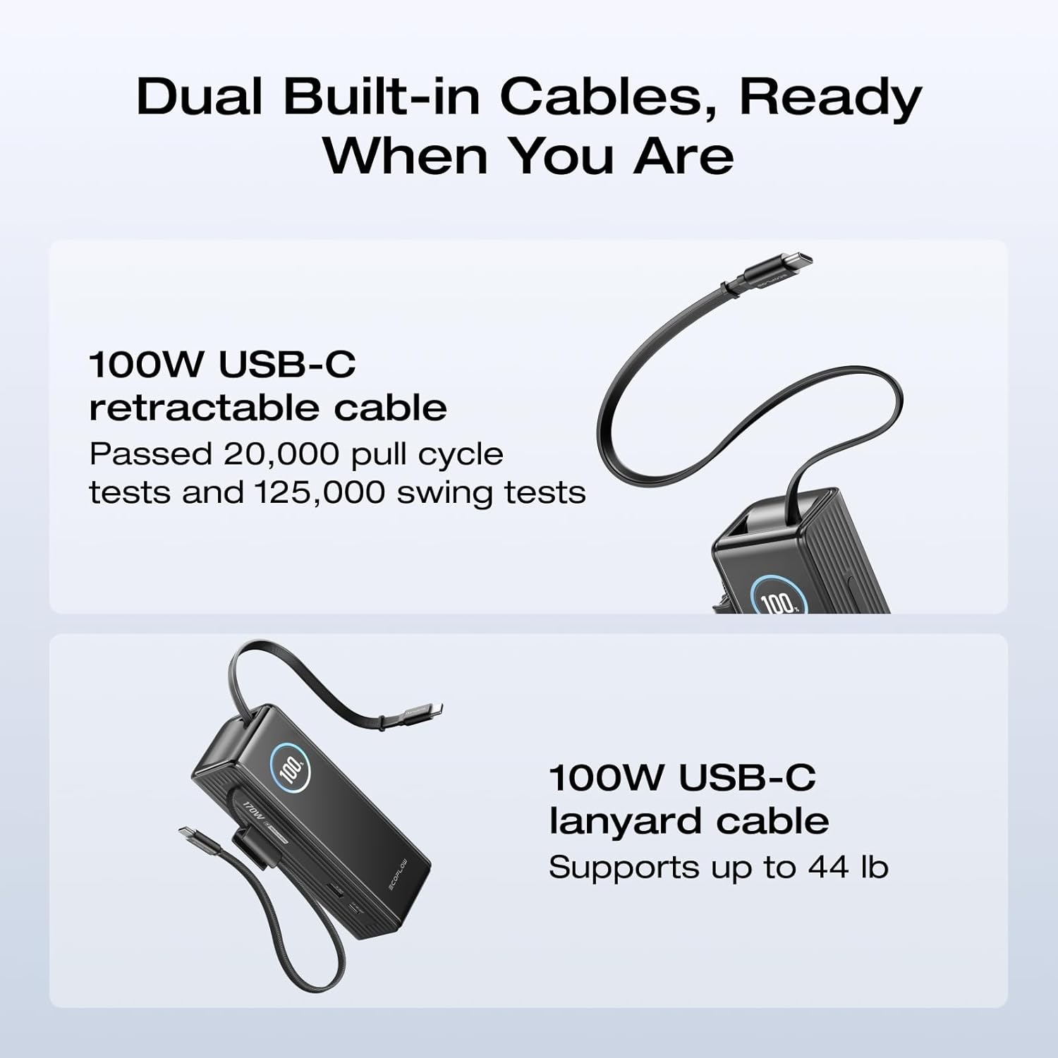 Multi-Device Power Bank: 2 × USB-C ports, 1 × 67cm retractable USB-C cable, 1 × 26cm lanyard USB-C cable