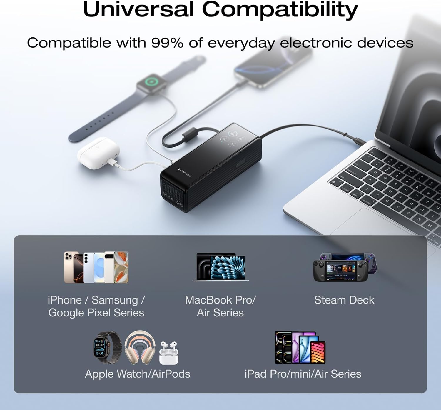 25,000mAh Capacity, Air-Travel-Friendly*: Can fully charge a MacBook, meeting remote work needs for 1-2 days. Can charge your phone 4-5 times, eliminating battery anxiety.