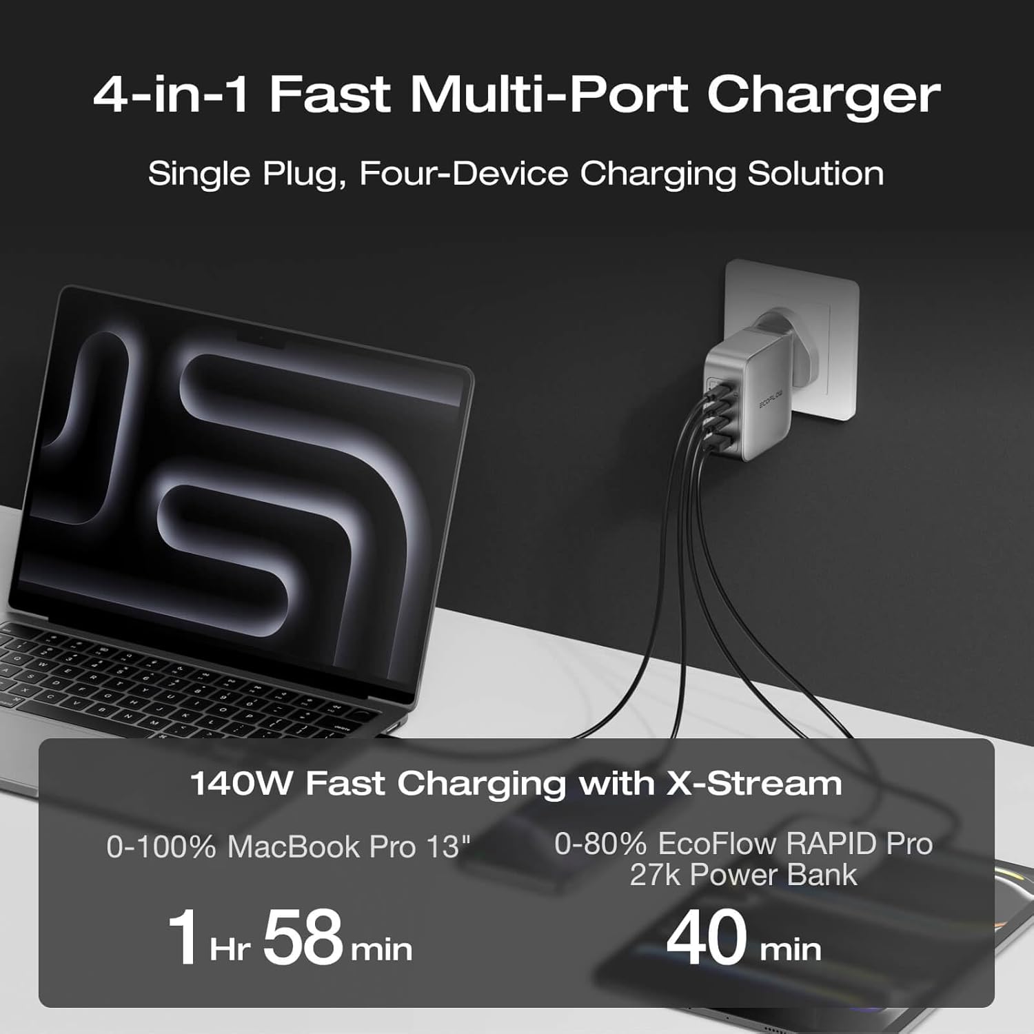 4-in-1 Fast Multi-Port Charger: Power up your laptop, phone, and earbuds simultaneously with one multi-port fast charger. Offering up to 140W fast charging with X-Stream, it takes just under 2 hours to fully charge a MacBook Pro 13".