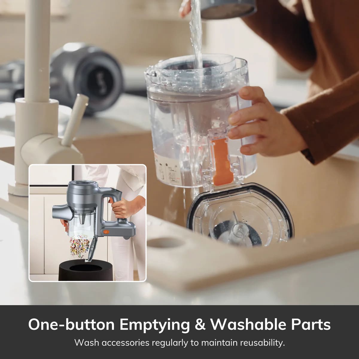 One-touch dust disposal and washable filter. Plus, the innovative dual dust cup system and advanced filtration technology ensure cleaner air and optimal performance.