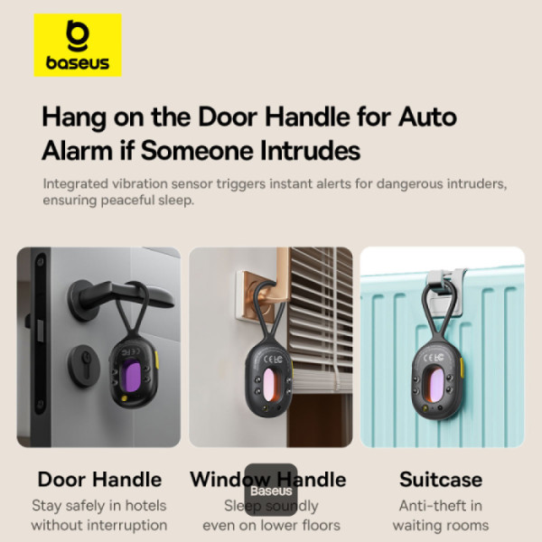 Automatic Door Handle Alert: Detects and alerts for unexpected intrusions when attached to door or window handles.