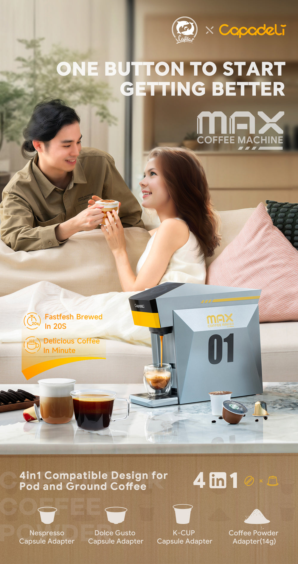 Brew using Nespresso, Dolce Gusto, Keurig K‑Cup, or your own ground coffee—thanks to its four interchangeable heads