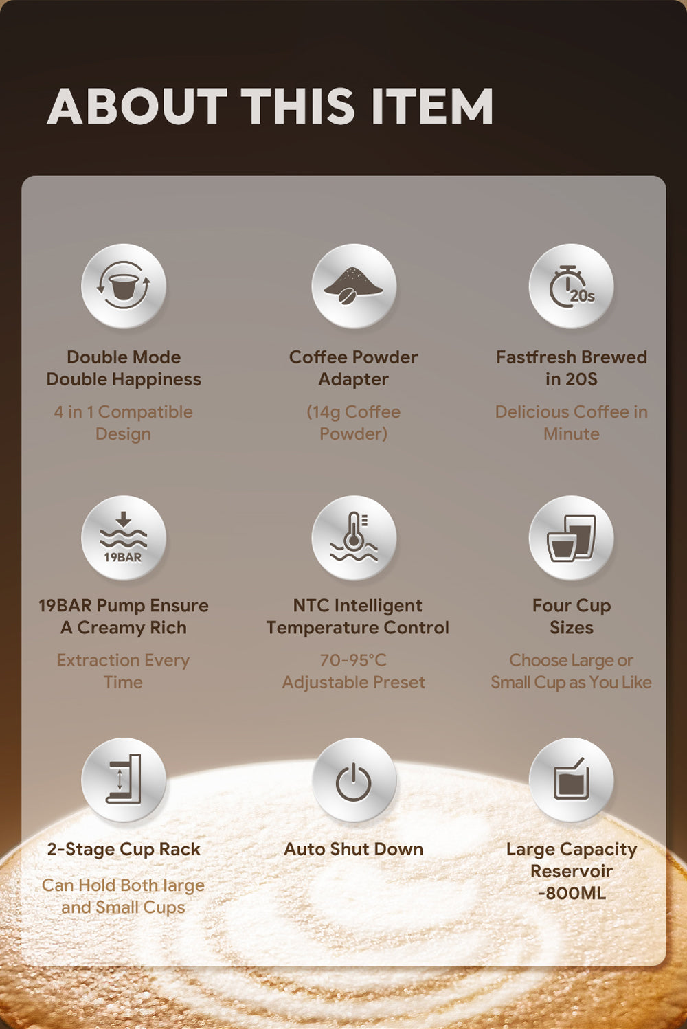 Supports both hot and cold beverages; ideal for espresso, Americano, cappuccino, or iced coffee.