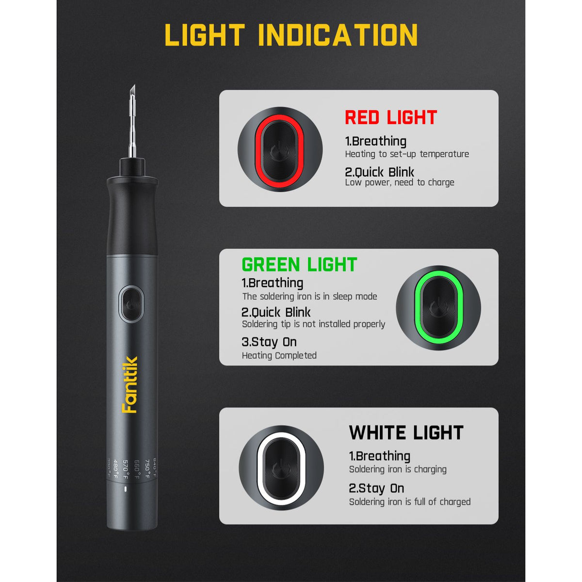 After powered on, the soldering iron stand still for 15 seconds will enter sleep mode. Fanttik T1 MAX will automatically restart to heat up to the temperature you set when picking it up again. NOTE: The red light will flash when heating, while the green light is always on when heating is finished.