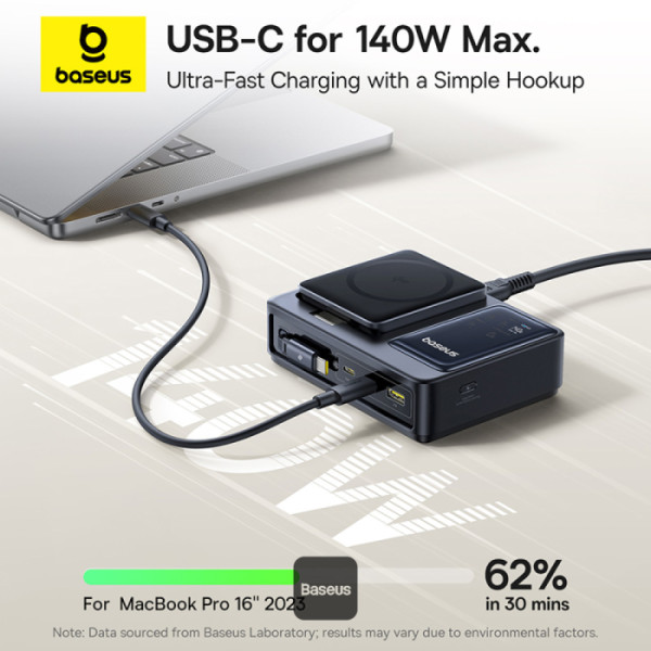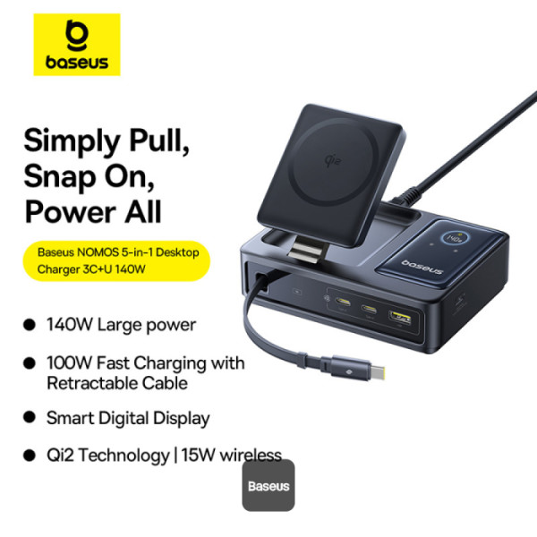 What's In The Box: 1*Baseus Nomos 5-in-1 Desktop Charger 3C+U 140W UK Qi2 Wireless Charger+Retractable Cable+Digital Display and User Manual