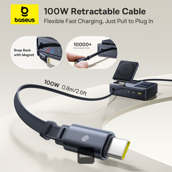100W Retractable USB-C Cable: Built-in high-power cable for fast and tangle-free charging