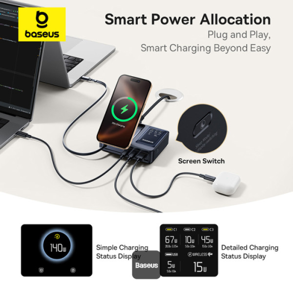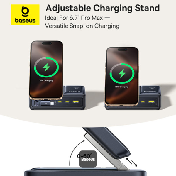The intelligent LCD display provides real-time power status, while the adjustable magnetic stand ensures optimal wireless charging for your smartphone. Built with advanced safety features, the Baseus Nomos desktop charger protects against overcharging, overheating, and short circuits, making it the ideal choice for both home and office use.