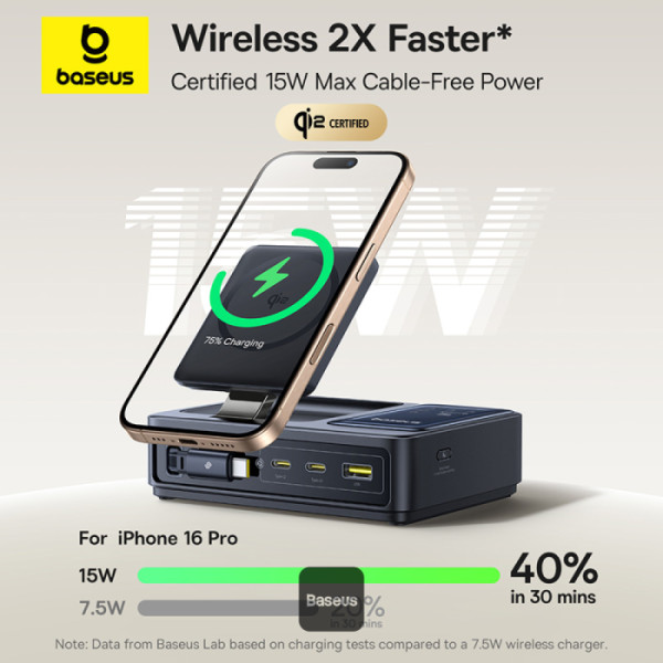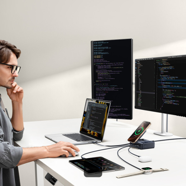 Upgrade your workspace with the Baseus Nomos Qi2 5-in-1 USB & Type-C Desktop Charger, a high-performance charging station designed for convenience and efficiency. This all-in-one power hub features a 100W retractable USB-C cable, Qi2-certified MagSafe wireless charging, and multiple ports to power up all your devices seamlessly. Whether you're charging your iPhone 16/15/14/13/12 series, MacBook, iPad, Samsung Galaxy, or other USB-C devices, this fast-charging hub keeps your desk organized and clutter-free.