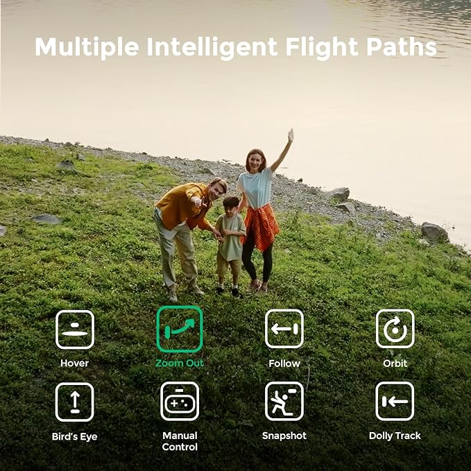 Experience hands-free flying with the pre-programmed flight paths, including Hover, Follow, Zoom Out, Orbit, Bird’s Eye, Manual Control, etc.