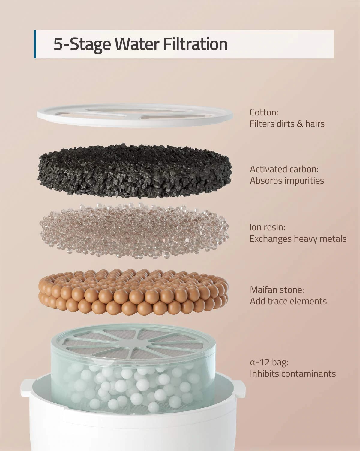 A 5-tiered filtration system whisks away any impurities so you never have to worry about your pet getting sick while taking a sip of water.